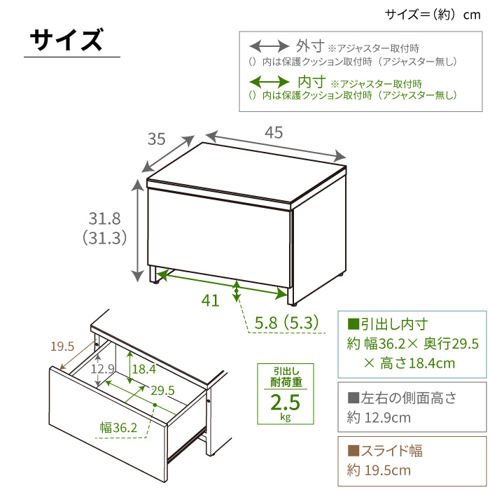 ■耐荷重:天板:20kg、引出し:2.5kg