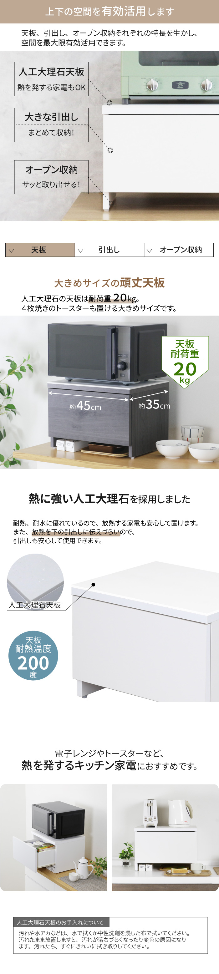 ・熱に強い人工大理石天板は耐荷重20kg!熱を発するキッチン家電の定位置にピッタリ
