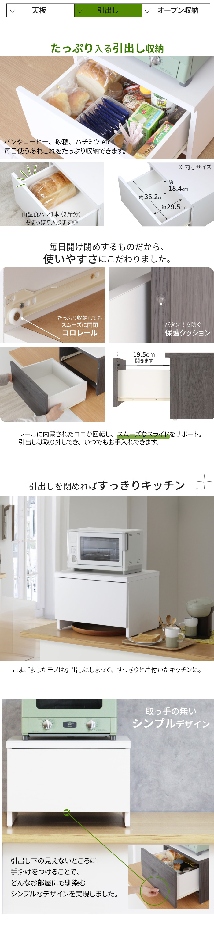 ・大容量の引出しは、コロ付きでスムーズ開閉