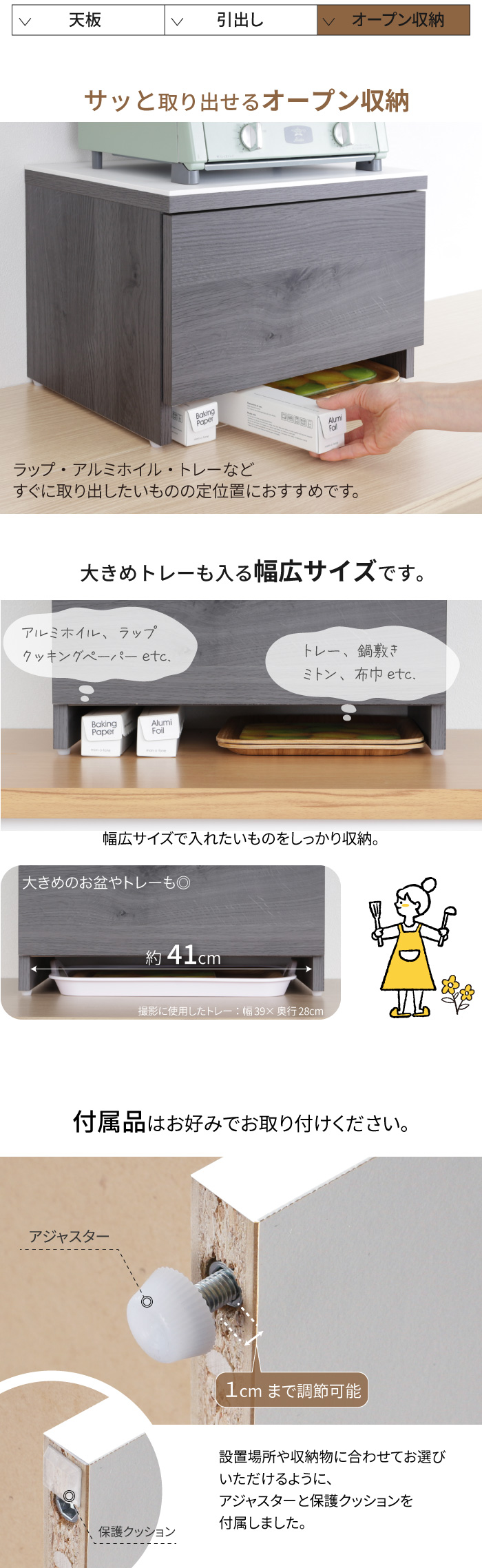 ・引出し下のオープン収納にはサッと取り出したいトレーやアルミホイルを