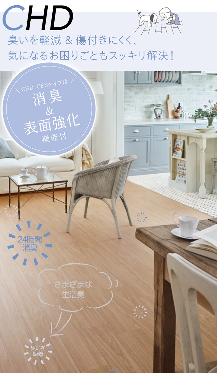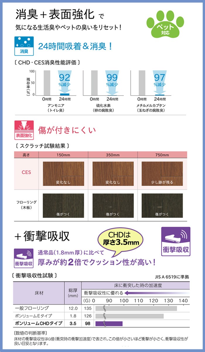 ◆機能:抗ウィルス、耐次亜塩素酸、衝撃吸収、消臭、表面強化、ペット対応、抗菌、防カビ、さらっと加工