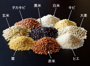 穀物麹の原料は栄養バランスに優れた<白米、大麦、玄米、赤米、あわ、ひえ、きび、たかきび、黒米>の9種類。厳選した国産穀物のみを使用し、独自のバランスで配合しました。