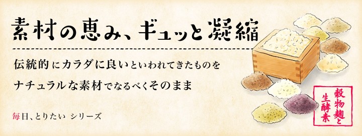 『毎日、とりたい 穀物麹と生酵素』は伝統的な日本の醗酵食品として知られる“麹”の恵みを、ぎゅっと凝縮したサプリメントです。大麦や玄米、黒米など厳選した9種類の国産穀物を、白・黒・黄3種類の麹菌で醗酵させた“穀物麹”を使っています。健康や美容に良いとされる醗酵パワーを摂れるだけじゃなく、“穀物麹”に含まれる生きた食物酵素をそのまま摂れるのがうれしいポイント。外食や加工食品が多いなど食生活が気になる方、加齢による栄養不足や偏りが気になる方のサポートにもおすすめです。
