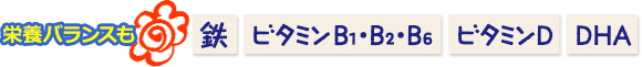 【栄養成分表示(20gあたり)】熱量80.6kcal、たんぱく質0.7g、脂質1.0g、炭水化物17.2g、食塩相当量0.02g、ナイアシン8.6mg、パントテン酸2.8mg、ビタミンB1 0.7mg、ビタミンB2 0.5mg、ビタミンB6 0.7mg、ビタミンD 3.2μg(58)、カルシウム280mg(41)、鉄6.6mg(97)、CBP(濃縮乳清活性たんぱく)12mg、DHA 40mg
