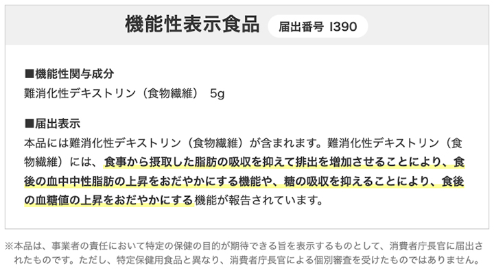 本品には難消化性デキストリン(食物繊維)が含まれます。難消化性デキストリン(食物繊維)には、食事から摂取した脂肪の吸収を抑えて排出を増加させることにより、食後の血中中性脂肪の上昇をおだやかにする機能や、糖の吸収を抑えることにより、食後の血糖値の上昇をおだやかにする機能が報告されています。