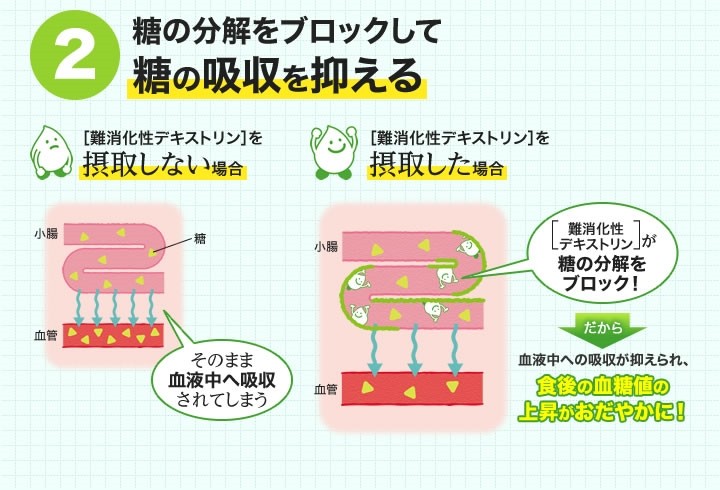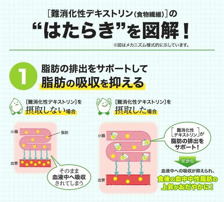 [難消化性デキストリン(食物繊維)]は、食事から摂取した脂肪の吸収を抑えて排出を増加させることにより、食後の血中中性脂肪の上昇をおだやかにする機能や、糖の吸収を抑えることにより、食後の血糖値の上昇をおだやかにする機能が報告されています。食後の血中中性脂肪・血糖値が気になる方におすすめです。