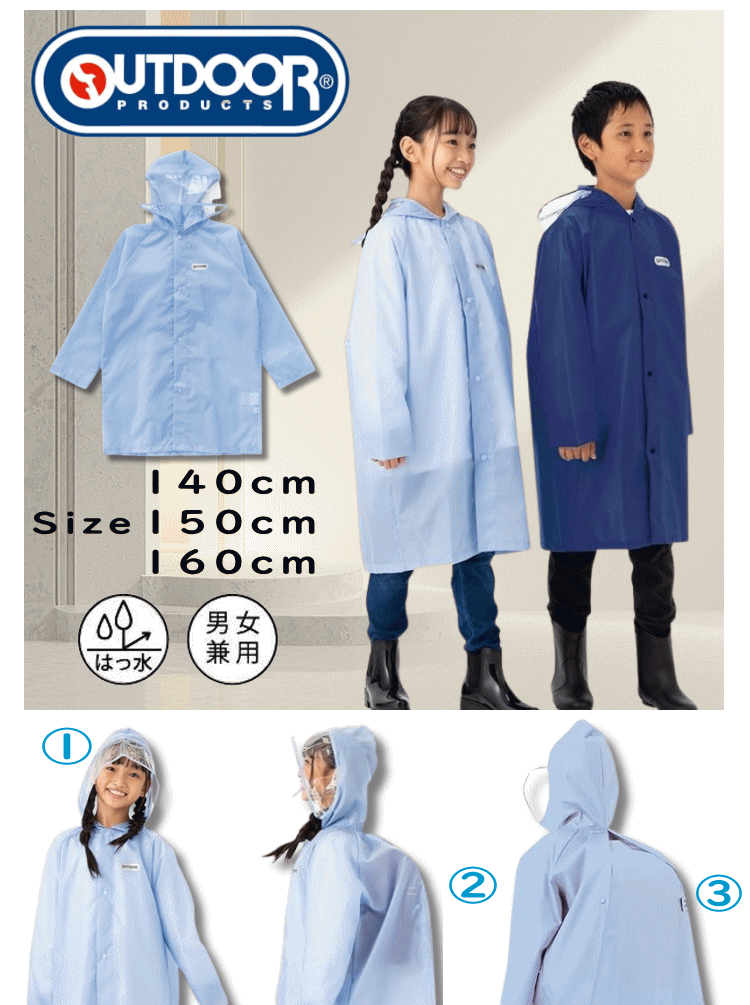レインコート 雨具 合羽 カッパ outdoor products アウトドアプロダクツ 小学生 中学生 ロング丈 自転車 通勤 通学 ネイビー色 ライトブルー色 05002346