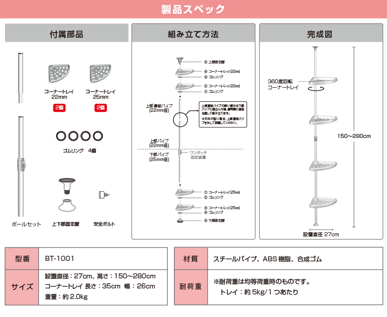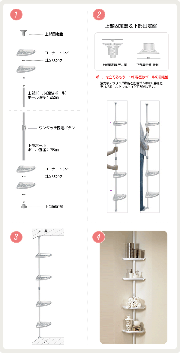 【簡単】ワンタッチ式突っ張りポールハンガーラック バスラック 4段 三角トレイ付 総耐荷重20kg 高さ150-280cm 浴室収納 ドリームハンガー BT-1001 正規品 爆買