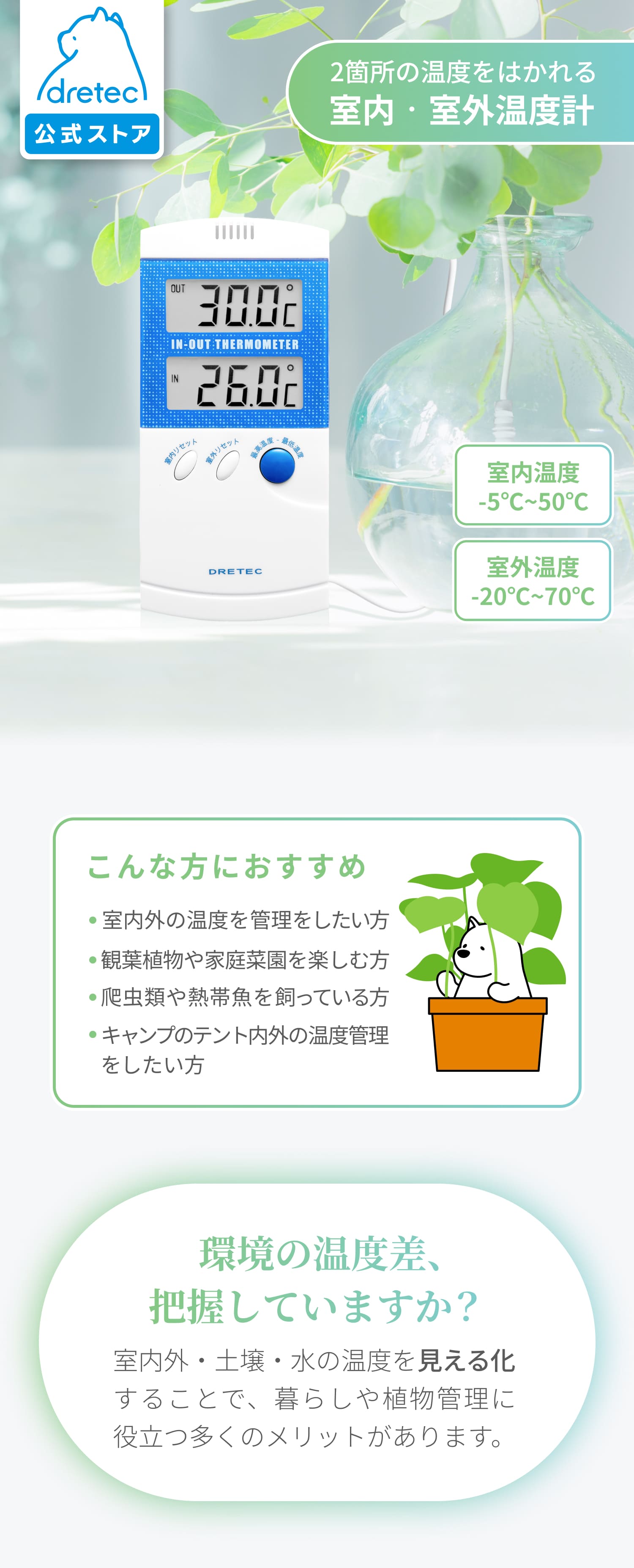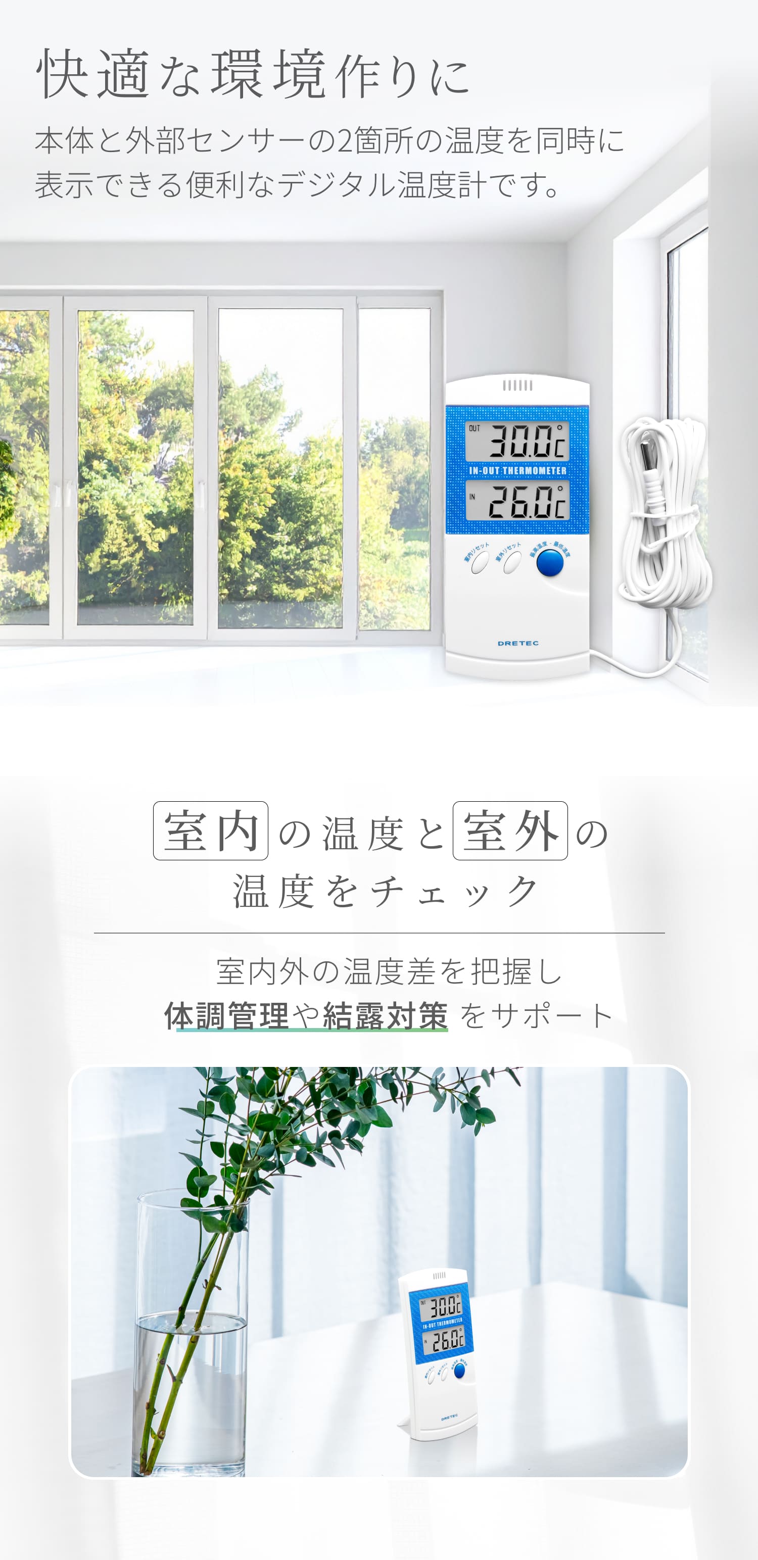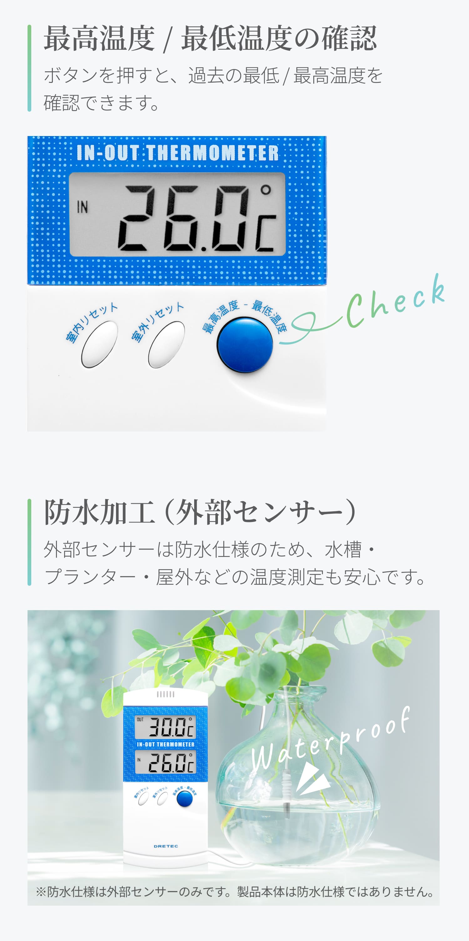 ドリテック 公式 温度計 2点測定 2箇所表示 外部センサー 冷蔵庫 温度管理 食品管理 水槽 水温計 植物用 観葉植物 ガーデニング 室内 室外 dertec O-209