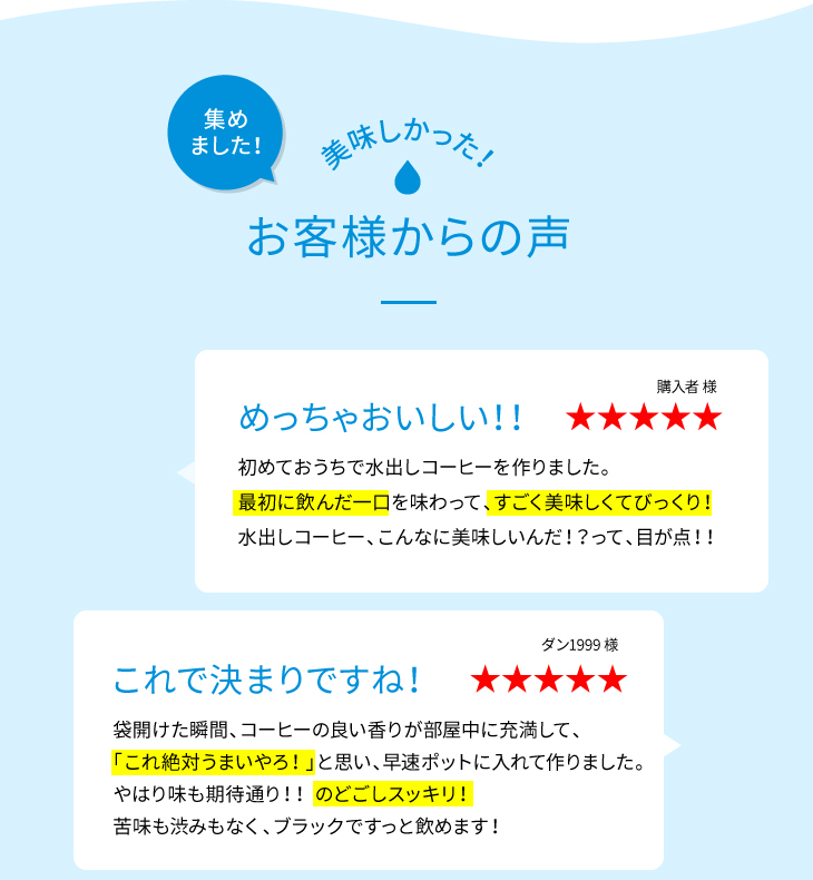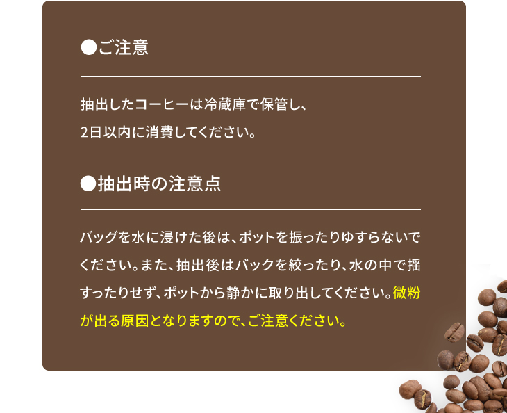 【水出しバックの付着物について】パックを封している箇所の黒い点は、製造の過程で付着するコーヒーの粉でございます。品質に問題はございませんので、ご安心くださいませ。