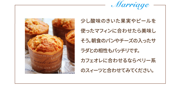 少し酸味のきいた果実やピールを使ったマフィンに合わせたら美味しそう。朝食のパンやチーズの入ったサラダとの相性もバッチリです。