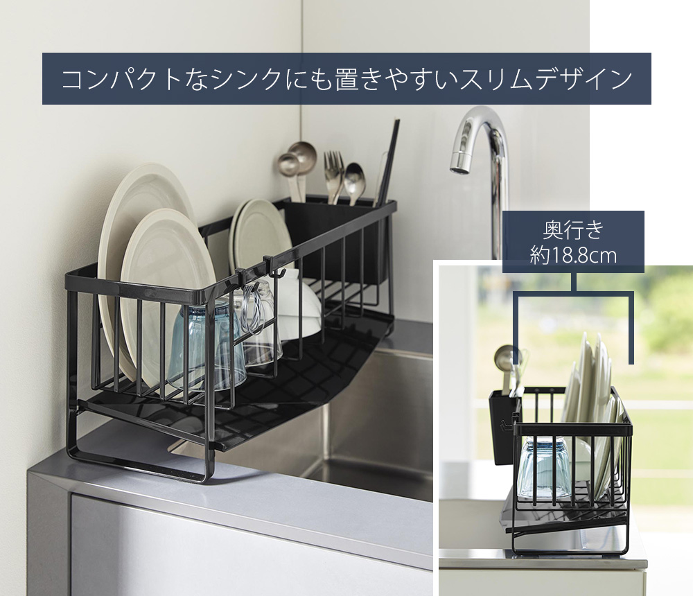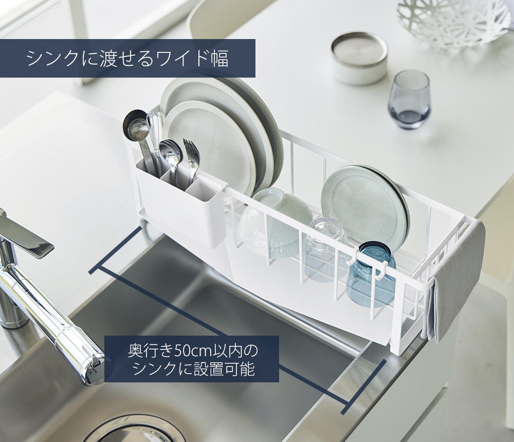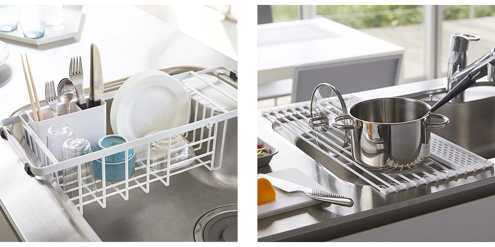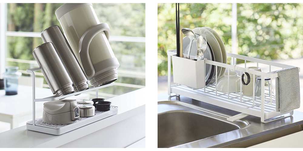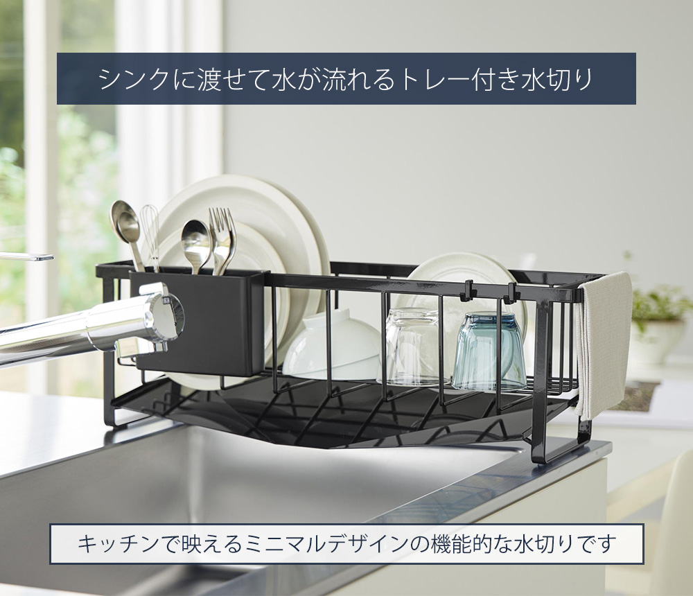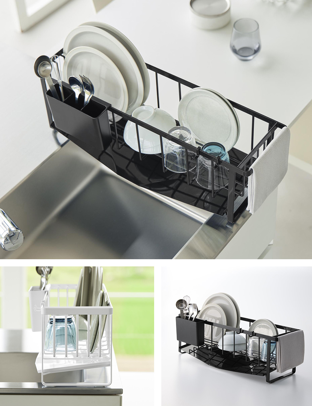 towerで人気のシンクに渡せる水切りラックに、食器から落ちる水を集めてシンクに流せるトレー付きの新仕様が登場。towerらしいキッチンで映える機能的なミニマルデザインで、空間全体をすっきりと整えてくれます。