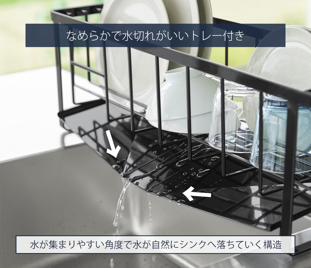 食器から落ちた水が集まりやすい角度で自然にシンクへと流れていく構造の、泣けらかで水切れのいいトレー付き。