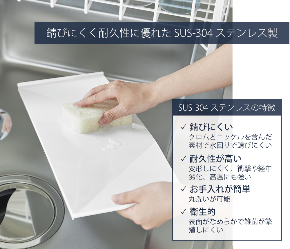 トレーは錆びにくく、耐久性に優れたSUS-304ステンレスを使用しています。汚れが付きにくいのでお手入れが簡単で、雑菌が繁殖しにくく衛生的にご使用いただけます。