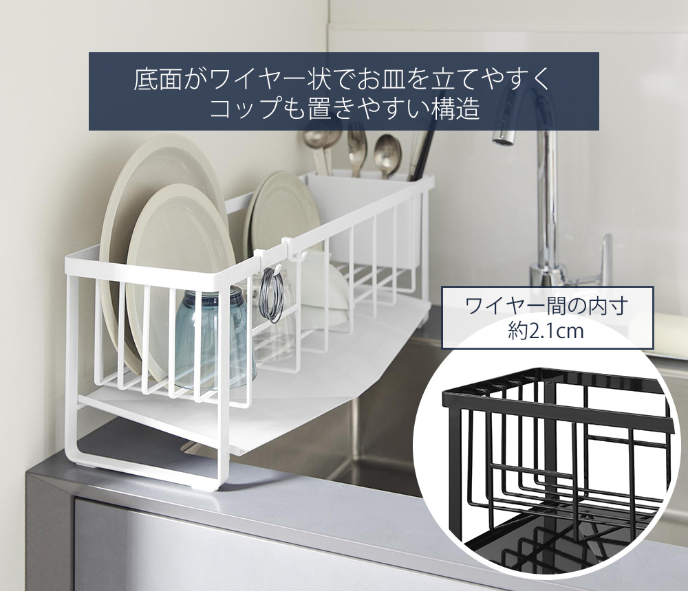 奥行きがスリムですが、底面がワイヤー状でお皿を立てられるので、食器類が複数入ります。ワイヤー感の内寸は約2.1cmで広すぎない+交差しているのでコップやお椀なども収納しやすい構造です。