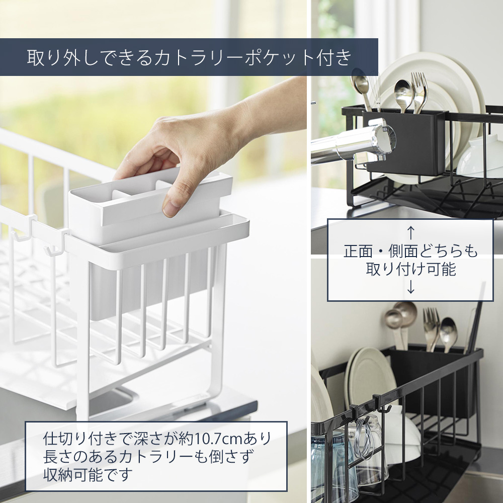 水切りラックの正面・側面どちらにも取り付けが可能な、取り外しできるカトラリーポケット付き。仕切り付きで深さが約10.7cmあるので、長さのあるカトラリーも倒さずに収納できます。