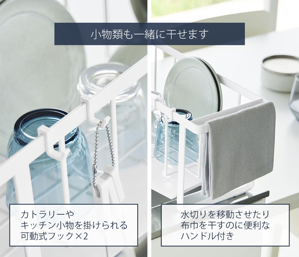 カトラリーやキッチン小物を掛けるのに便利な可動式フックが2つと、布巾を干すのに便利なハンドルも付いています。