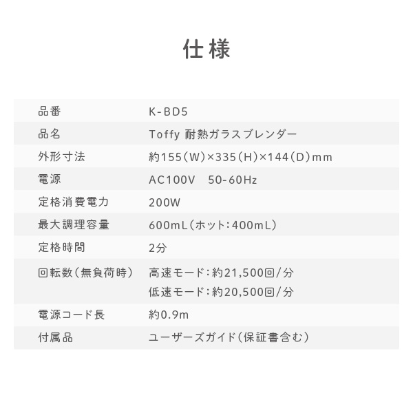 ミキサー ブレンダー ジューサー 小型 氷対応 耐熱ガラスブレンダー スムージー スープ ソース Toffy K-BD5-PA/-AW