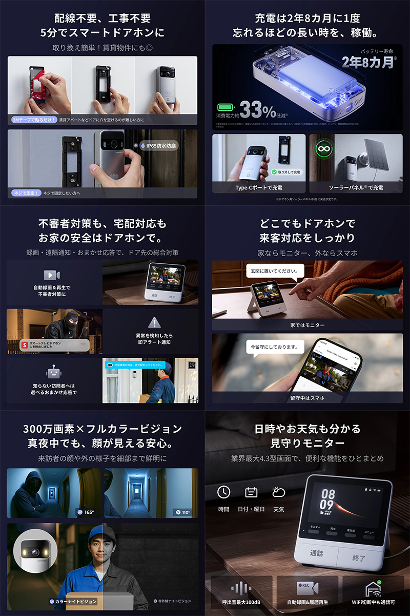 4.3型の液晶ディスプレイには、玄関先の映像だけではなく、日時やその日のお天気などが表示されます。呼び鈴の音量は最大100dB。一軒家や部屋の多い住宅、耳の遠いご家族がいる家庭でも、来訪者を知らせる呼び鈴を聞き逃すことはありません。Wi-Fiブースター技術で、通信範囲は最大100m。