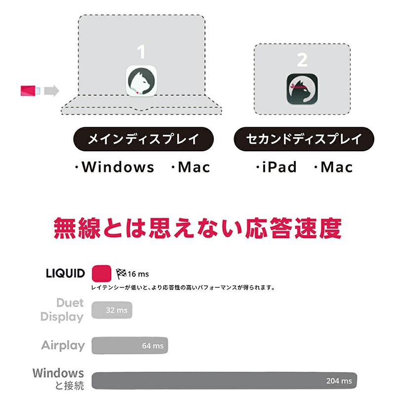LIQUIDは16msのレイテンシー。Duet Displayは32ms、Airplayは64ms、Windows Connectは204msと、他に比べてLIQUIDは高速です。