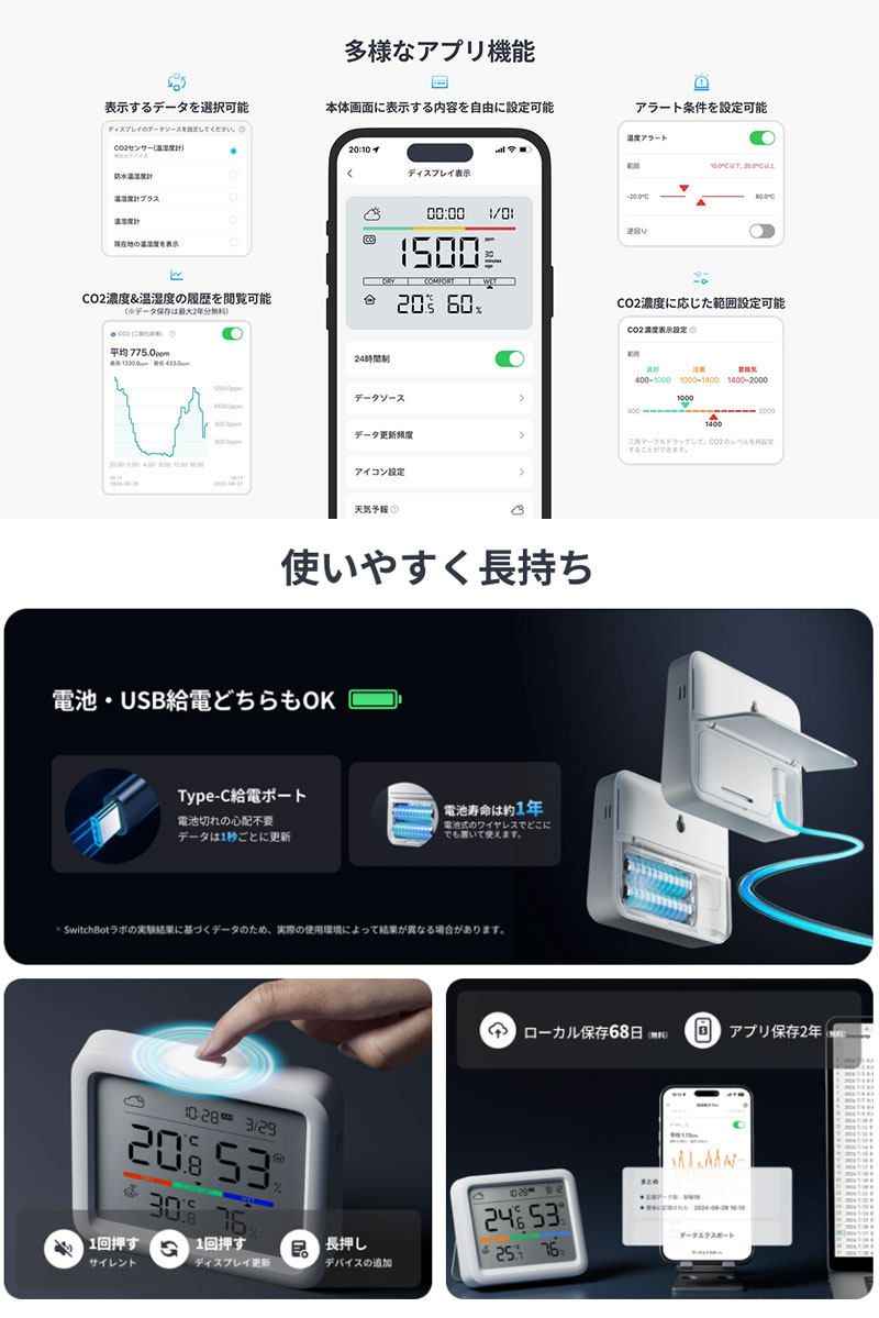 防水温湿度計は単体で68日分のデータをローカルに保存でき、SwitchBotハブミニ/ハブ2と併用で、2年分のデータをクラウドに保存可能。