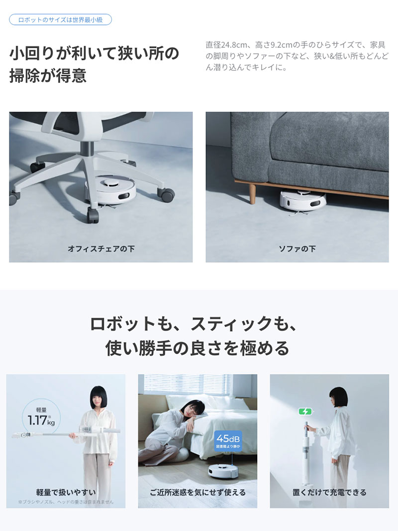 SilenTech技術でロボットの騒音レベルは図書館の静かさも凌ぐ45dB、スティックの騒音レベルは一般的な掃除機と比べて10dBカット、アパート暮らしや忙しくて夜間しか使えない方でも、時間帯を気にせず静かにお掃除可能。