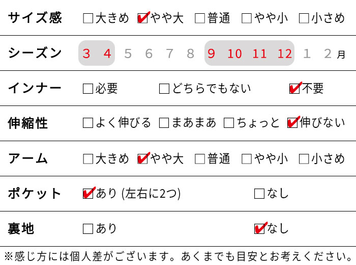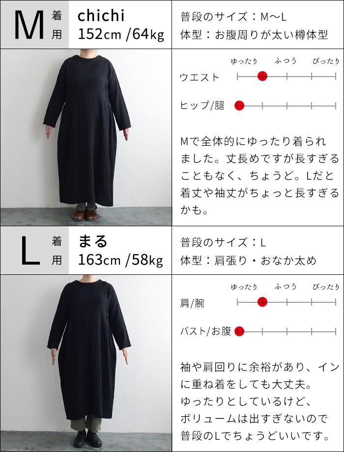 身幅ゆったり、肩部分の切り替えはない(身頃で切り替える)かたちなので、普段のサイズで余裕をもって着ていただけると思います。すっきり着たい方、インに重ね着はあまりしないという方は、サイズ表(特に袖幅)を確認の上、サイズダウンしても。スタッフ着用画像も合わせてご検討ください。