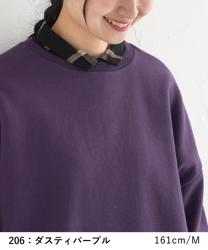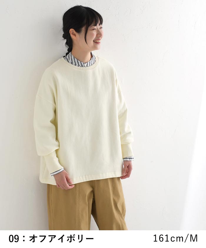 M〜3L プルオーバー トレーナー 長袖 レディース 裏起毛 綿100%/ カジュアル ナチュラル シンプル 体型カバー ゆったり Aライン トップス あったか 無地 エコロコ e+, Ms,Ls,LL,3L, 30代 40代 50代/ 秋冬 大きいサイズ 裏毛 柔らか オフアイボリー 白 ホワイト ダスティパープル 紫 アプリコット 赤 レッド チャコール 灰色
