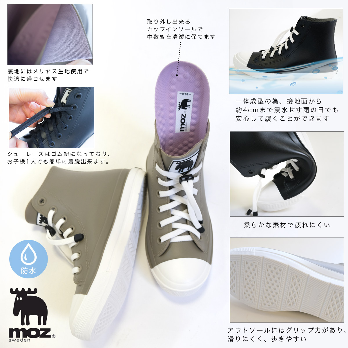 アミアミ moz モズ キッズ レインブーツ レインシューズ 長靴 送料無料 晴雨兼用 ハイカット 撥水 防水 レースアップ 柔らかい ジュニア 滑らない 滑りにくい靴 雨 すべりにくい靴 履きやすい 雨晴れ兼用 小さいサイズ 紐 白 小学校 雨 梅雨 通学 外遊び ホワイト ブラック ブラウン 茶色 黒 19 19.0 20 20.0 20.5 21 21.0 21.5 22 22.0 22.5 23 23.0 19cm 19.0cm 19.5cm 20cm 20.0cm 20.5cm 21cm 21.0cm 21.5cm 22cm 22.0cm 22.5cm 23cm 23.0cm 入学 入園 お祝い 祝い プレゼント 親子コーデ おそろい リンクコーデ ママ 親子ペアルック 爆買