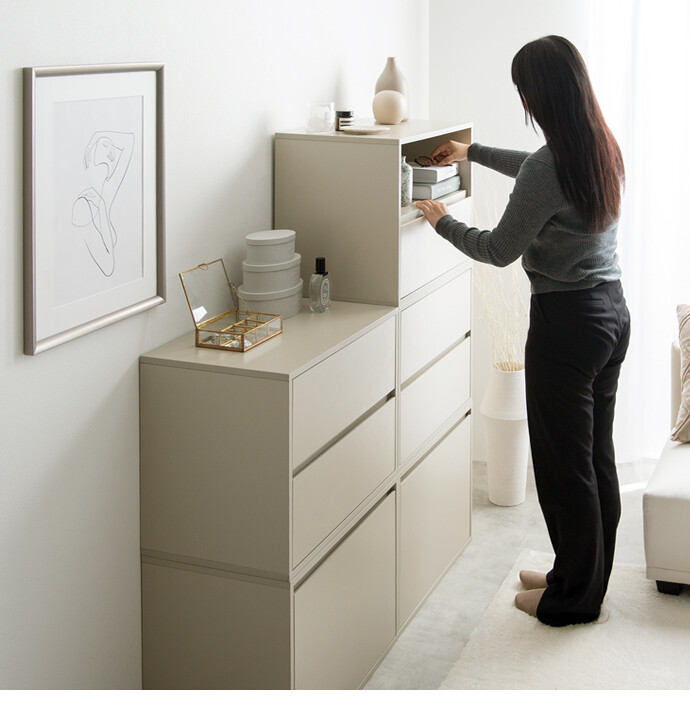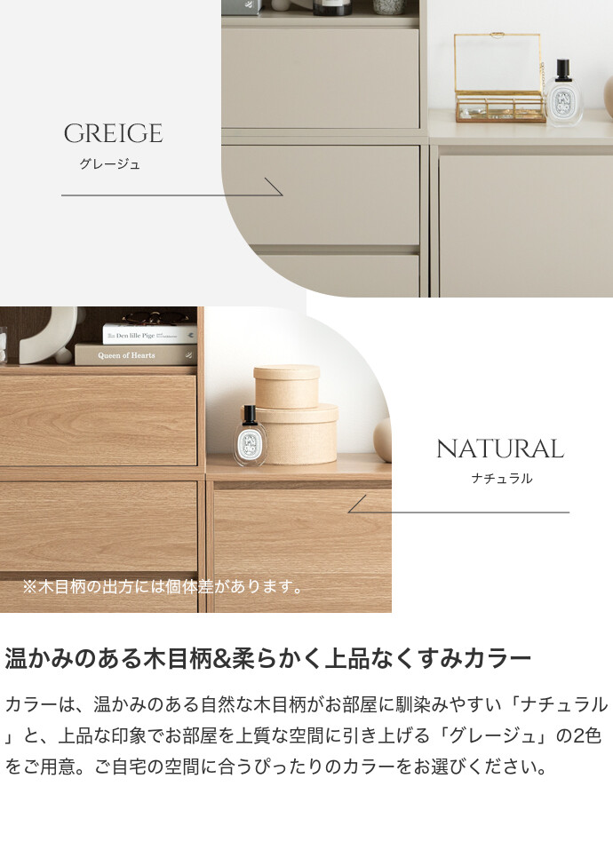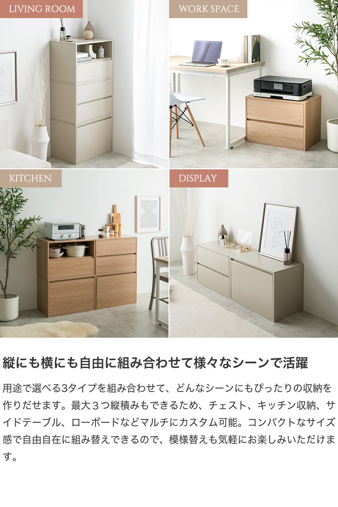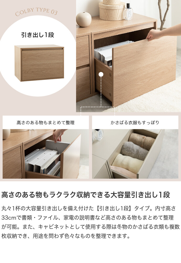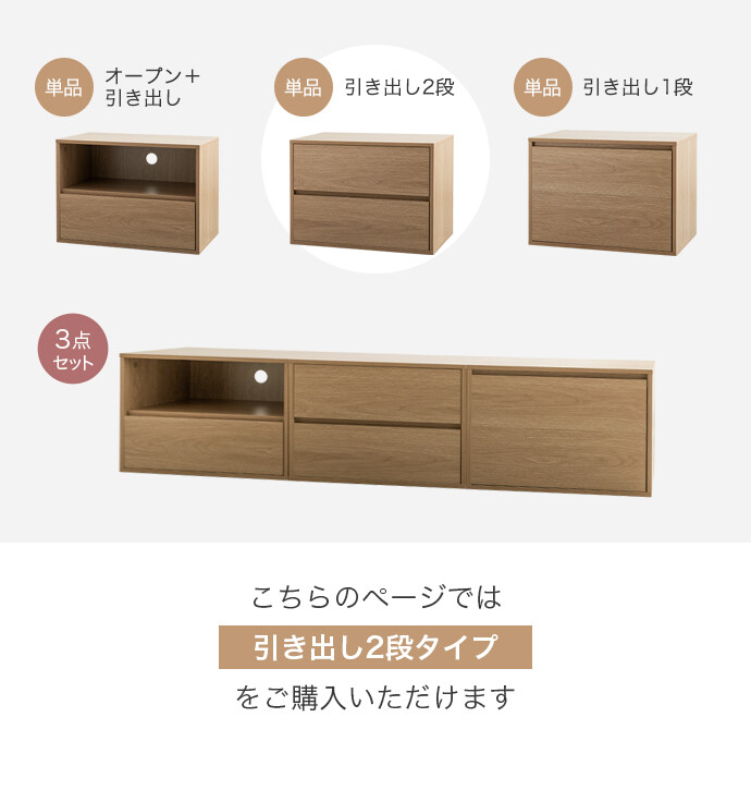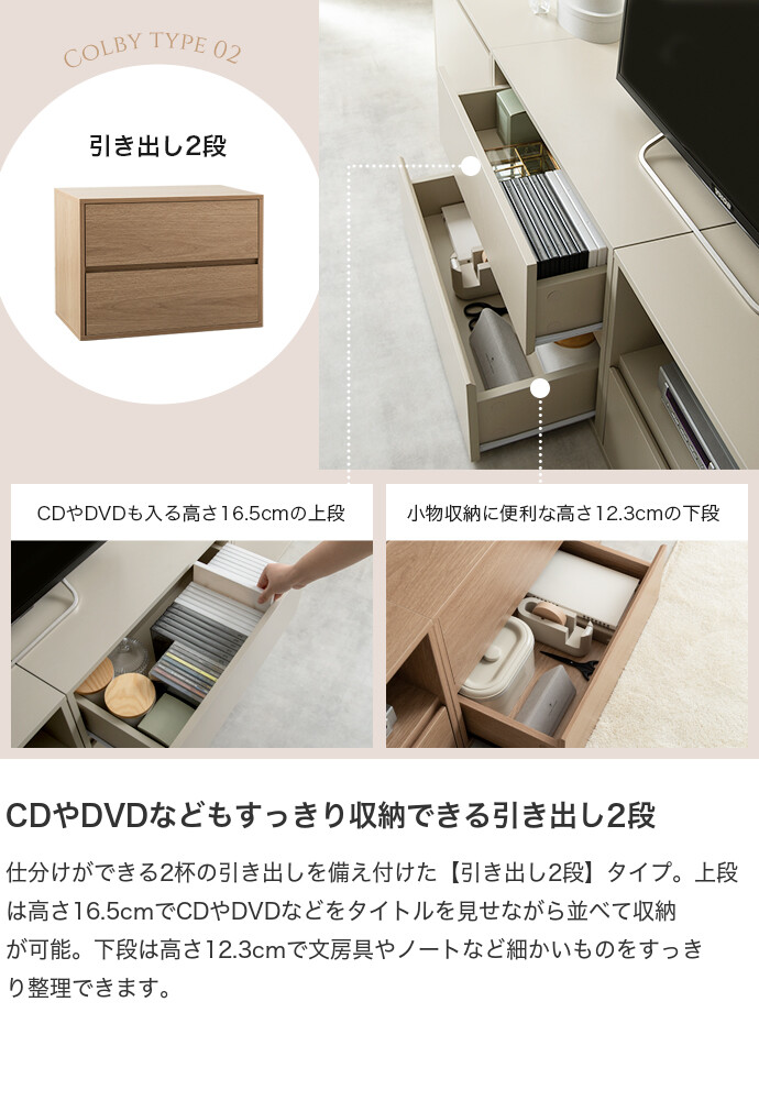 思い通りの収納スタイルに変幻自在な組み合わせテレビ台『Colby』シリーズの引き出し2段タイプ。単品使いでも便利な選べる3タイプで、テレビ台だけでなく、キャビネットやサイドテーブルなど、組み合わせによって様々な収納家具にカスタムできます。コンパクトながら大容量の収納力で、散らかりがちな小物をまとめて整理可能です。