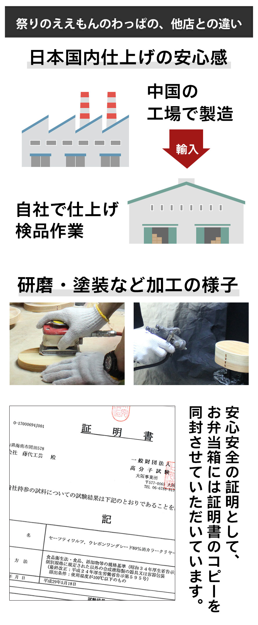 祭りのええもんでは、輸入後の商品を再度国内(自社工房)で調整・仕上げをすることで