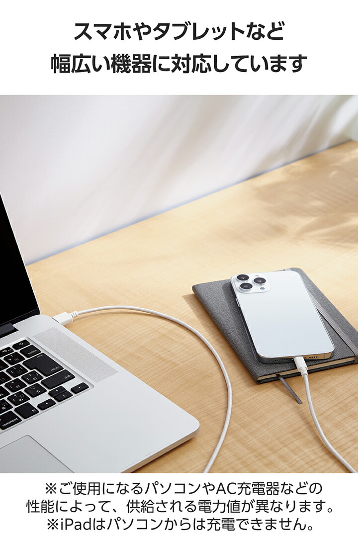 ■使用目的・用途:USB-Aポートを持つパソコンおよび充電器とLightningポートを搭載したiPhone/iPad/iPodを接続し、充電・データ転送が可能です。 ※iPadはパソコンからは充電できません。