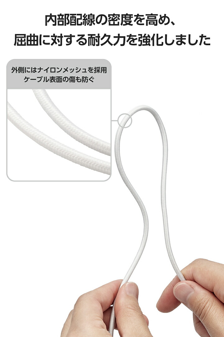 Lightningポート搭載のiPhone/iPod/iPadとUSB-Aポート搭載のパソコンおよびAC充電器を接続して充電・データ通信ができる高耐久ケーブルです。特に断線しやすいコネクター付け根部分の耐久力を約10倍まで高めています。 ※当社比