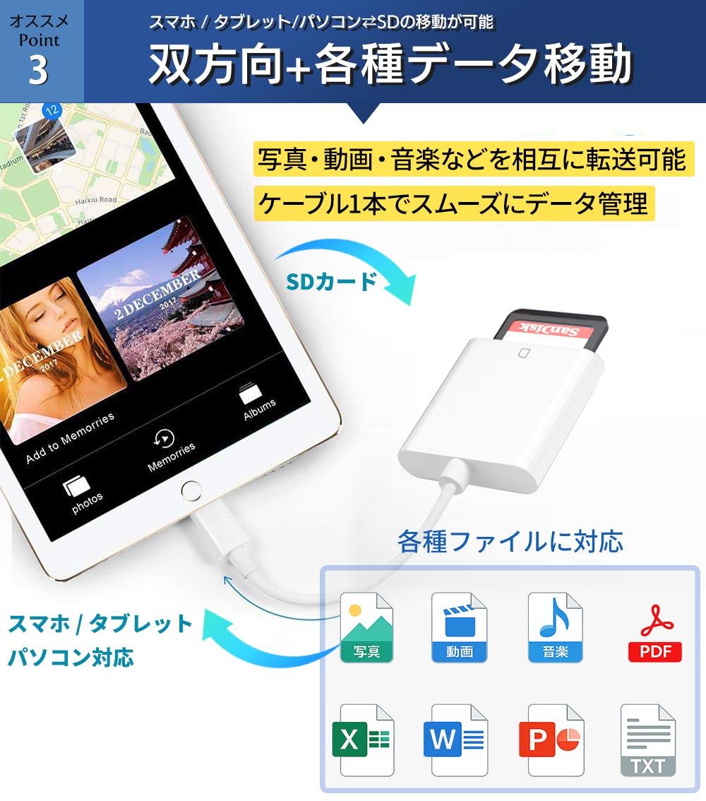 ・SDカードやmicroSDカードを挿して接続するだけで、写真・動画・音楽などを簡単に移動できます。