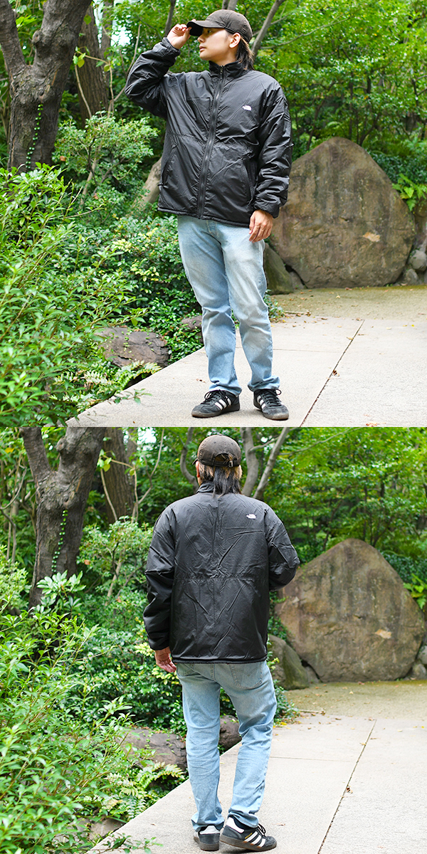 シルエットも中間着と合わせやすい、ややゆとりを持った仕上がりです。スタッフサック付き。