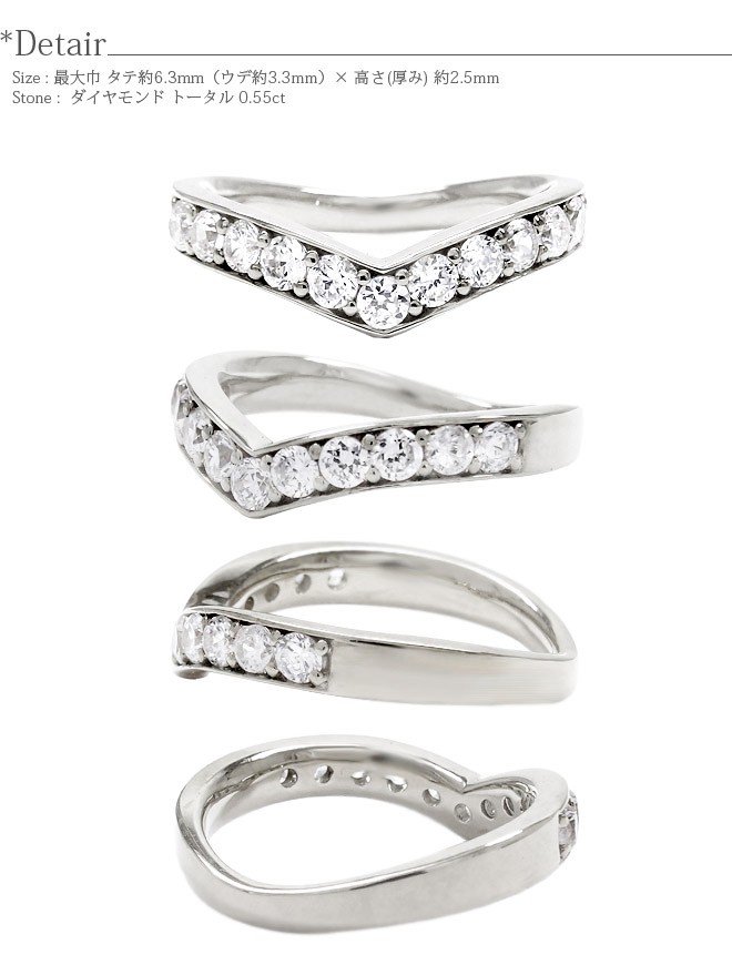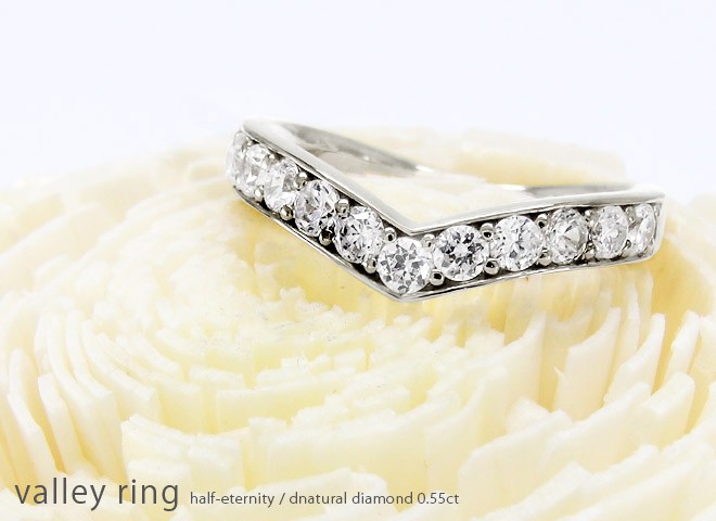 シンプルなハーフエタニティのVラインリングは、指をスッキリ長く見せてくれる効果があります。