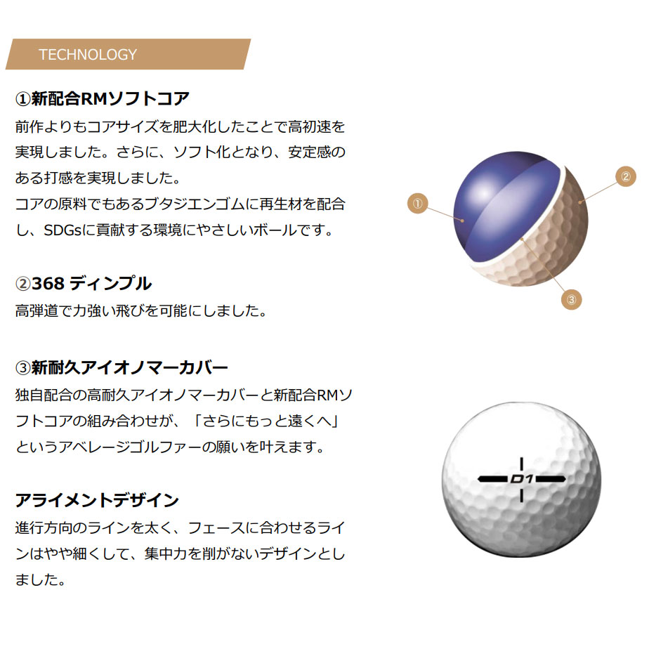 「もっと遠くへとばしたい」というゴルファーの声にこたえるために進化を続ける不動の人気No.1ボール『D1』。前モデルよりもコアを大きく、ソフトにすることで高初速で安定感のある打感を実現。コアの原料には再生材を配合し、SDGsにも貢献。飛んで、環境にもお財布にもやさしいボールです。