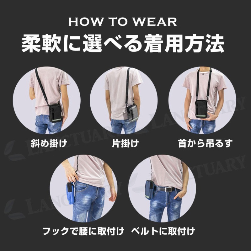斜めがけ・片掛け・ベルトに取り付け等、様々な着用方法を選ぶことができます。