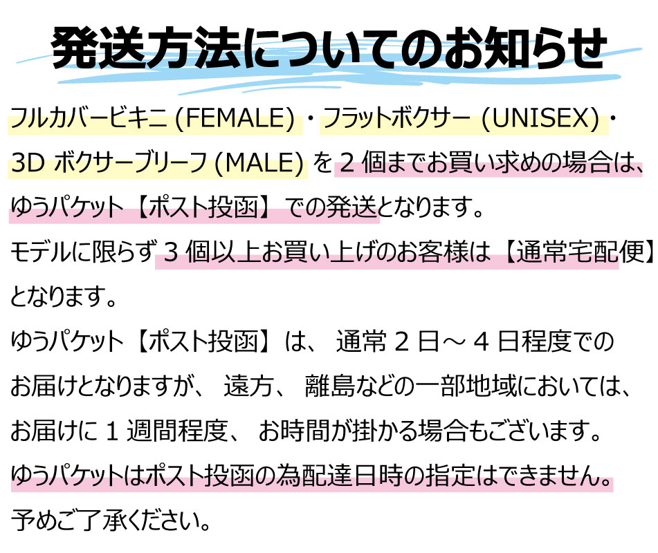 Full Cover Bikini (FEMALE) ・3D Boxer Brief (MALE) ・Flat Boxer Brief (UNISEX)・Eazy Thong (FEMALE) を2個以内でお買い求めの場合は、ゆうパケット【ポスト投函】での発送となります。
