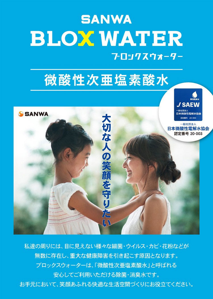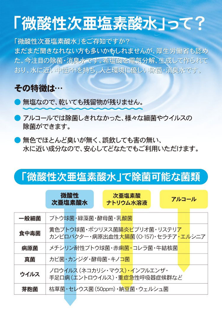 強力な除菌力を持つ無塩の『微酸性電解次亜塩素酸水』です。