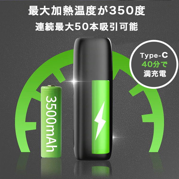 【バッテリー3500mAh】 大容量バッテリー3500mAh Samsung製バッテリーを内蔵 連続吸い50本 ※250℃-350℃ 180秒設定の場合 ※吸い方により異なります。
