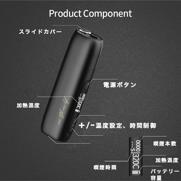 【ディスプレイ】喫煙時間、喫煙本数、喫煙温度、バッテリー残量、その他設定がディスプレイで確認できる。