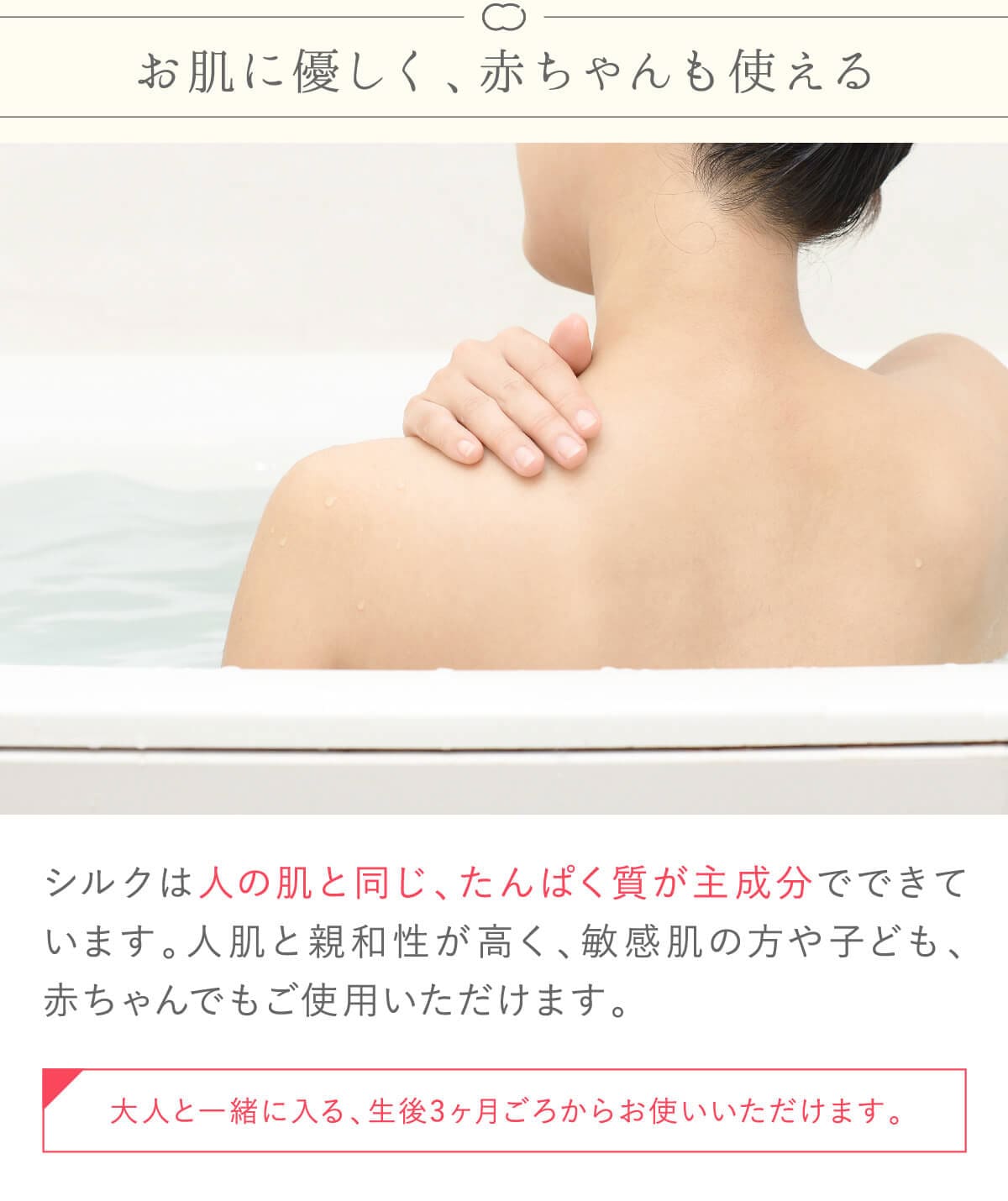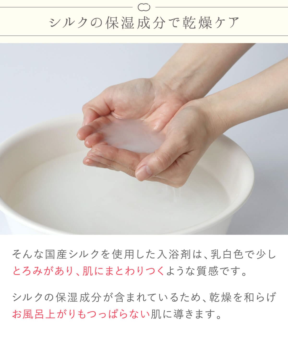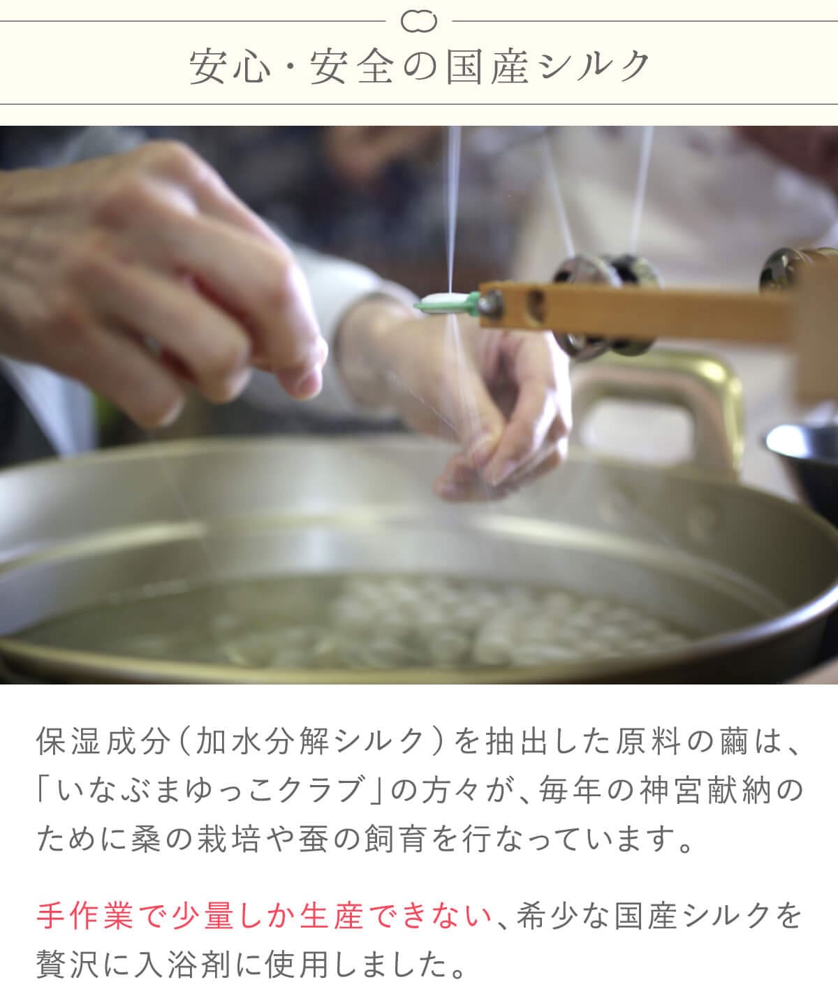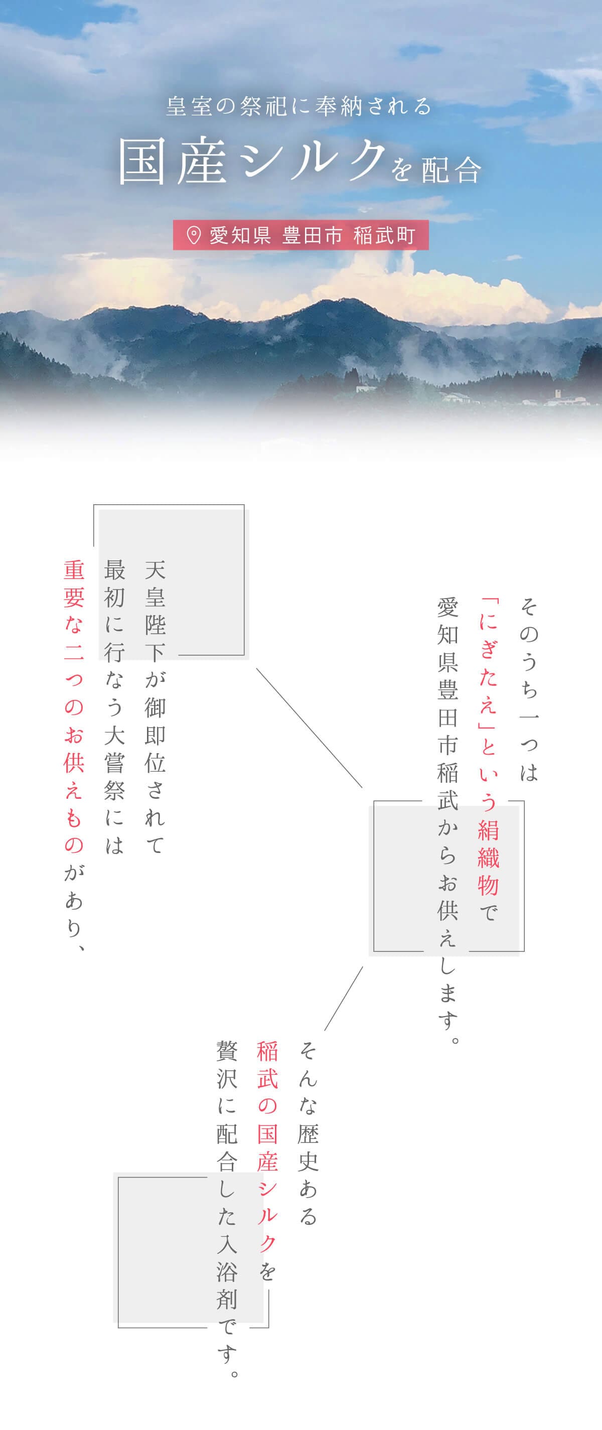皇室の祭祀にも使用される愛知県豊田市稲武町の国産シルクを使用した入浴剤です。