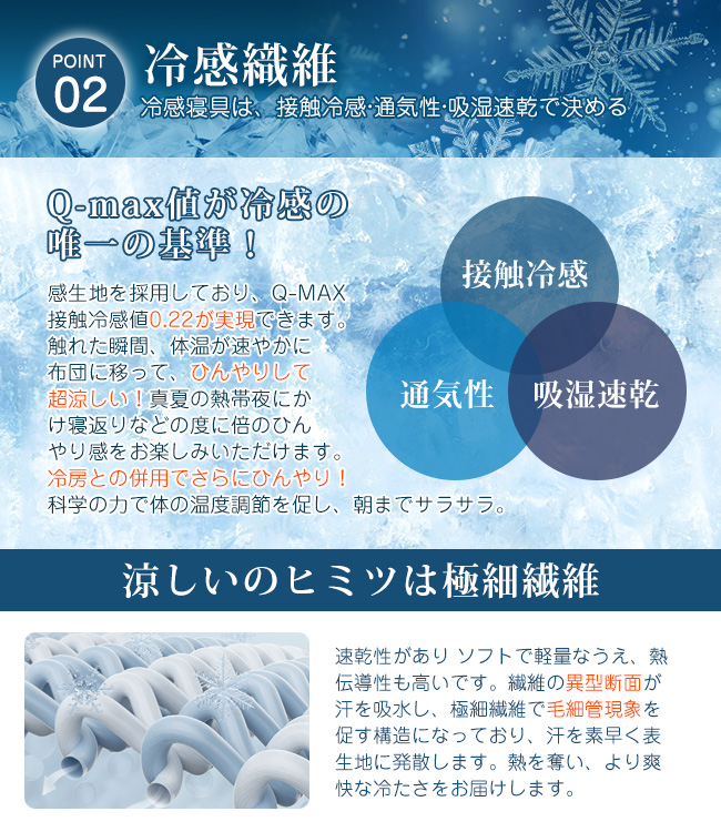 ・接触冷感素材を使用。寝返りのたびに心地良いひんやり感が伝わり、寝苦しい夜にもひんやりとした感触をお楽しみいただけます。冷房との併用でさらにひんやり!