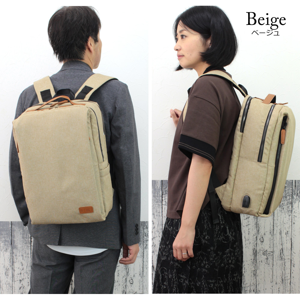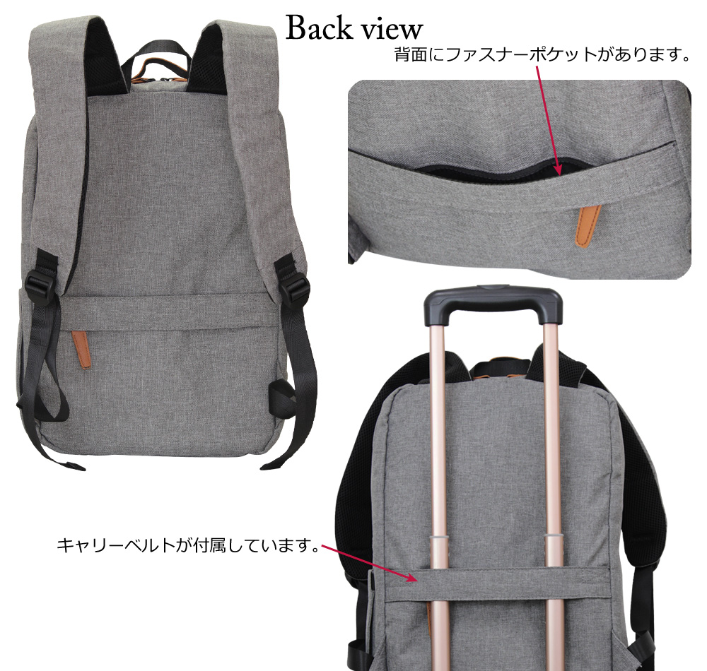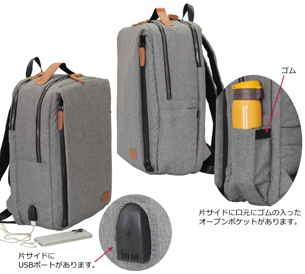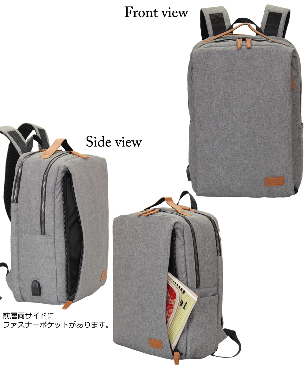 機能的で軽量な素材で作られたUSBポート付きのリュック前面部分に左右から収納できるファスナーポケットが付いていて右側のポケットにはキーストラップが付いています。メイン収納はオープンポケット大が1つと中が4つ付いています背中側のファスナーはクッションが付いていノートPCやタブレットの収納に片サイドにUSBポート付き。内側のケーブルにお手持ちのモバイルバッテリーを接続しておけば、バッグを開けずにいつでもスマホの充電可能!右サイドにはマチの広がるサイドポケット背面のベルトはキャリーバーに通して、キャリーオンで使えます。