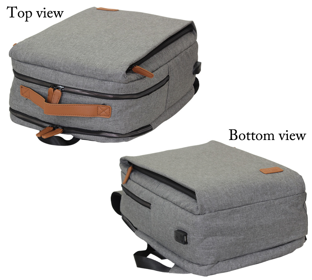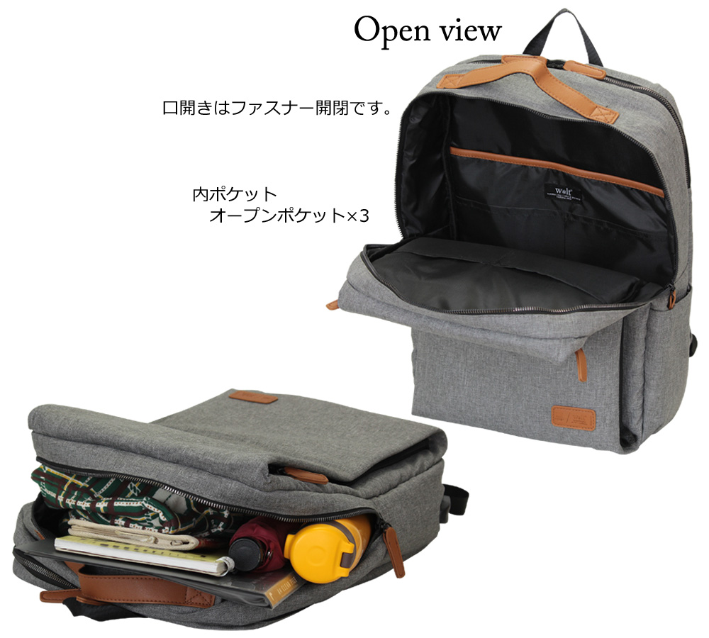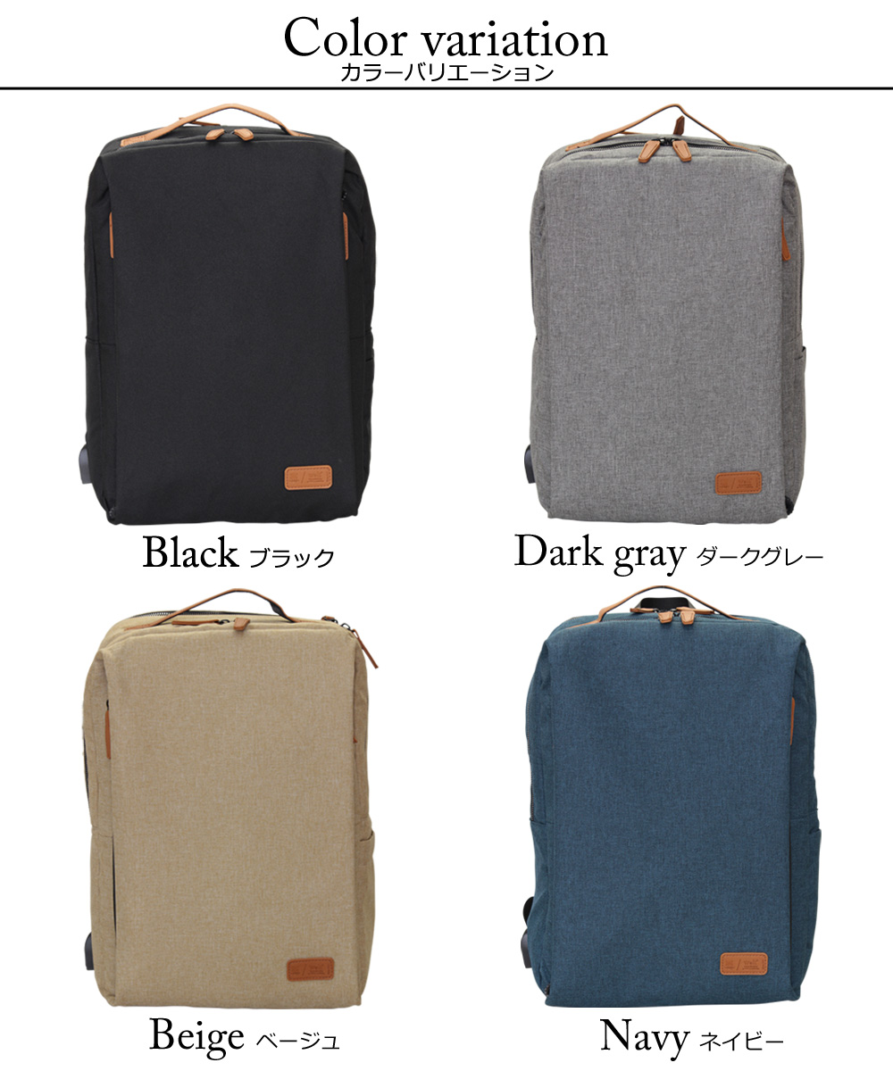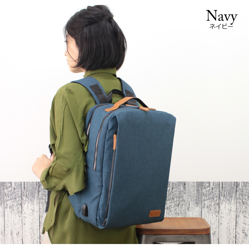 機能的で軽量な素材で作られたUSBポート付きのリュック前面部分に左右から収納できるファスナーポケットが付いていて右側のポケットにはキーストラップが付いています。メイン収納はオープンポケット大が1つと中が4つ付いています背中側のファスナーはクッションが付いていノートPCやタブレットの収納に片サイドにUSBポート付き。内側のケーブルにお手持ちのモバイルバッテリーを接続しておけば、バッグを開けずにいつでもスマホの充電可能!右サイドにはマチの広がるサイドポケット背面のベルトはキャリーバーに通して、キャリーオンで使えます。
