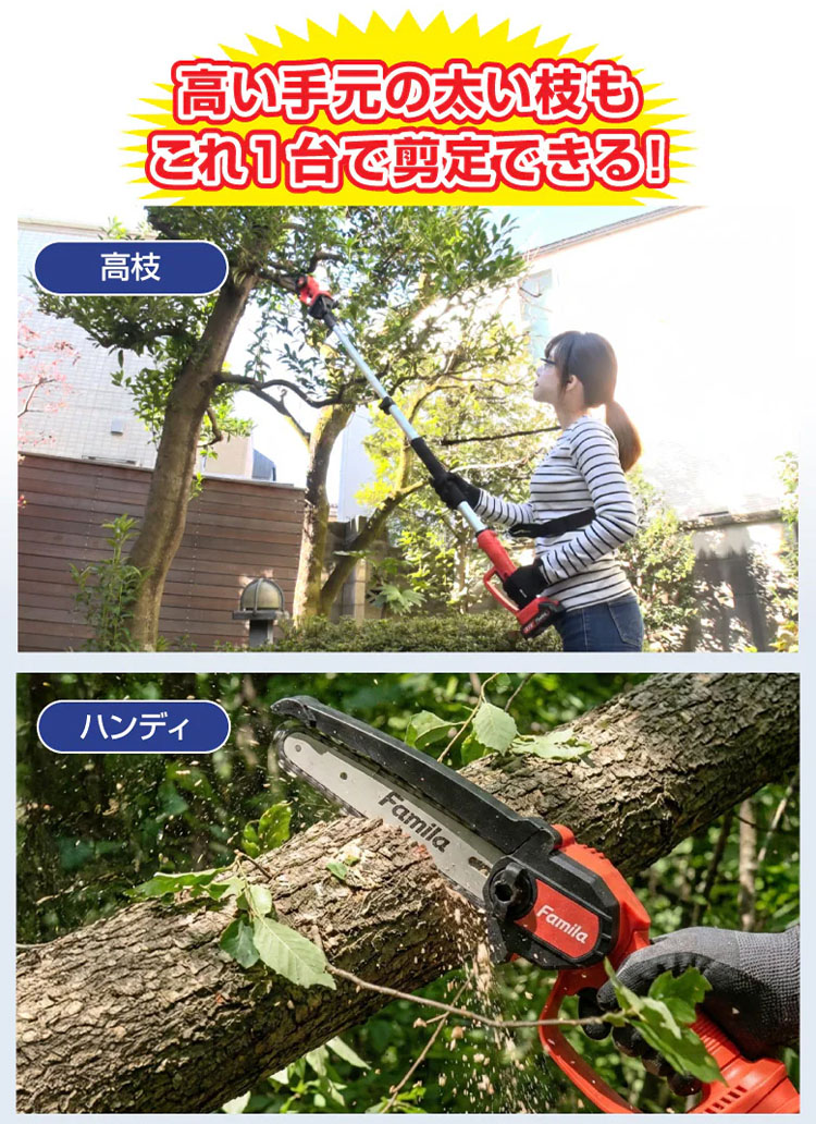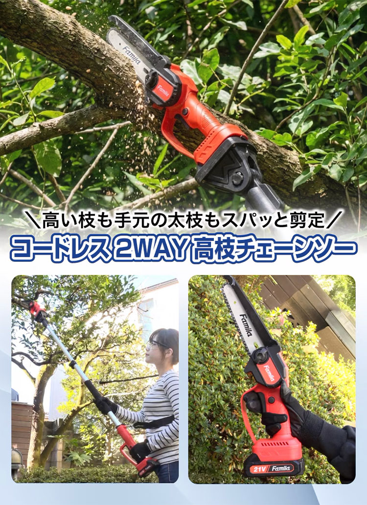 キーワード:4589978111681/ファミラ/高枝チェーンソー/高枝切り電動チェーンソー/2WAY/コードレス/充電式/高枝切りバサミ/高枝切り鋏/電動ノコギリ/充電式ノコギリ/ハンディソー/ミニチェーンソー/ポータブル/軽量/840g/超軽量/伸縮/最大190cm/18V/21V/大容量バッテリー/急速充電/静音/庭の手入れ/ガーデニング/剪定/枝打ち/太枝切り/伐採/高所作業/庭木/植木/生垣/竹切り/DIY/日曜大工/女性向け/初心者/簡単操作/安全設計/プロテクター付/保護メガネ/家庭用/業務用/外構/お掃除/粗大ゴミ/解体/薪割り/キャンプ/アウトドア/便利グッズ/時短/プレゼント/父の日/敬老の日/ギフト/ランキング/人気/おすすめ/TVショッピング/テレビショッピング/人気商品/