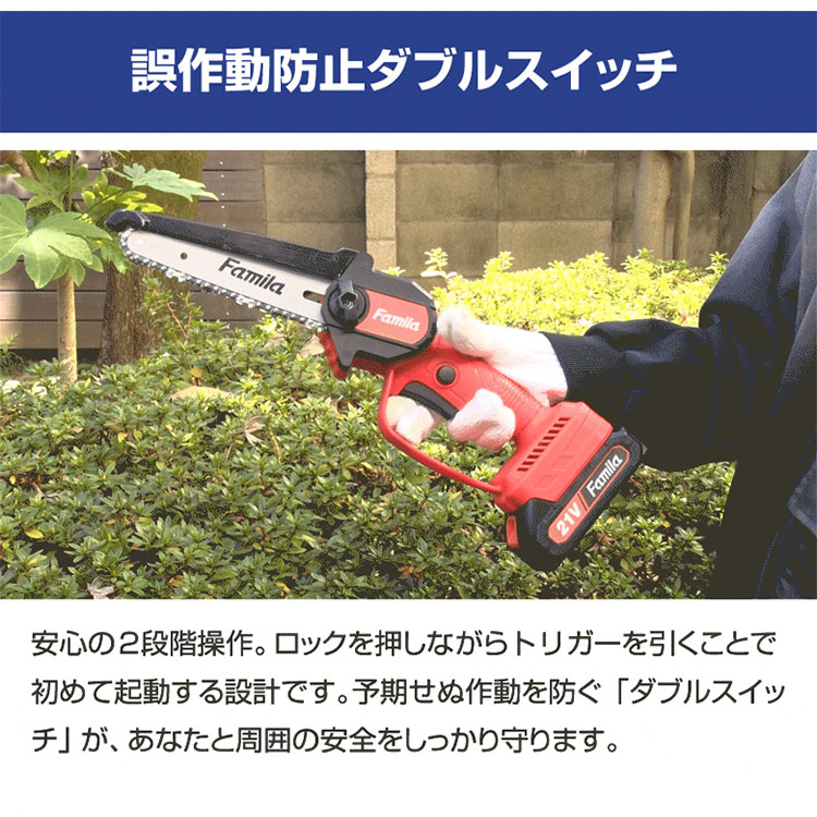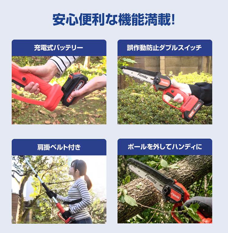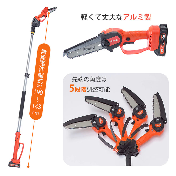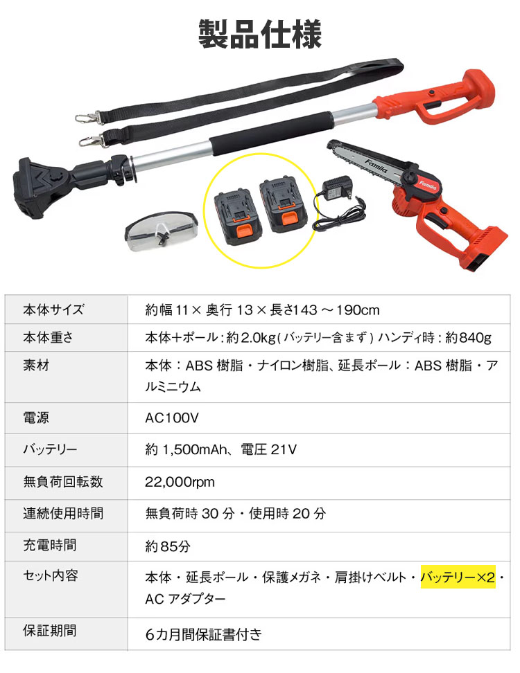 予備バッテリー付き NEW ファミラ 充電式コードレス2WAY高枝チェーンソー 6点セット高枝も太枝もこれ1台!1.9mの高さまで届く2WAYコードレス。超軽量840gで腕が疲れず女性も安心。急速充電&プロテクター付の安全設計。
