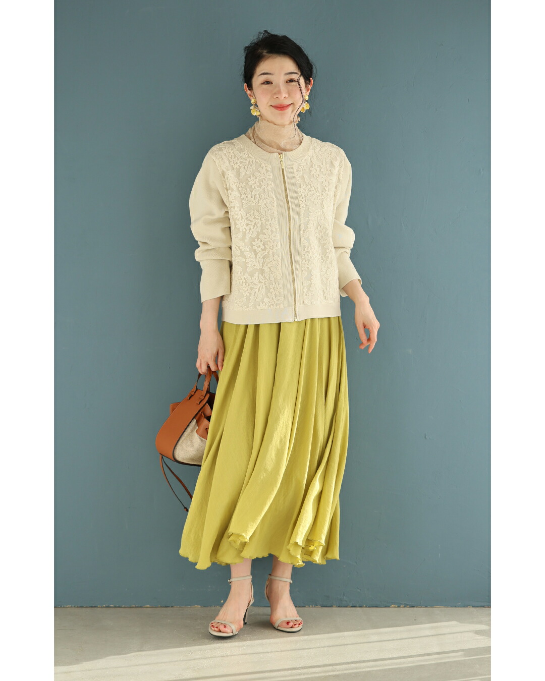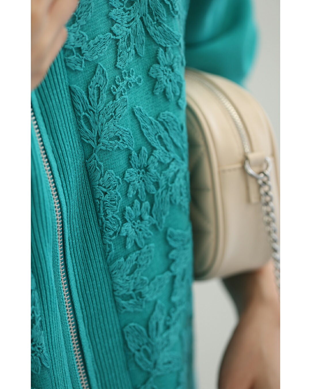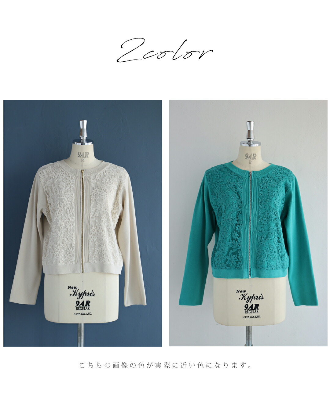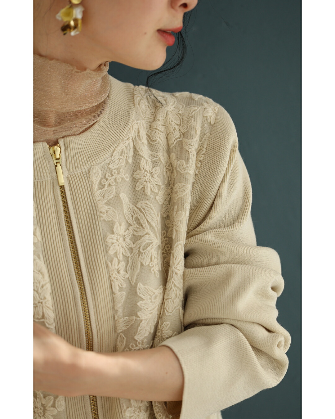 SからL対応 オーガンジーに咲く花刺繍のリブニットブルゾン