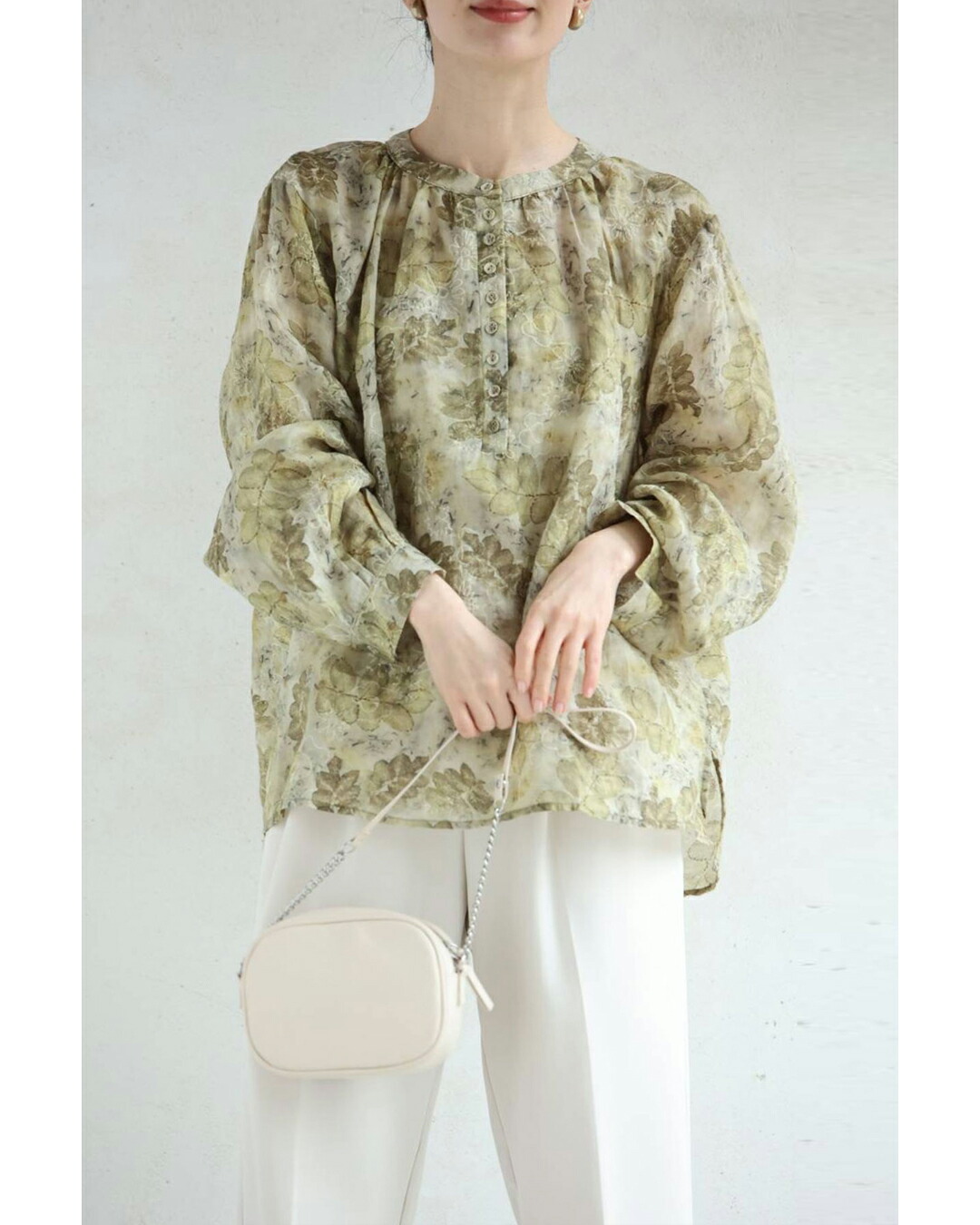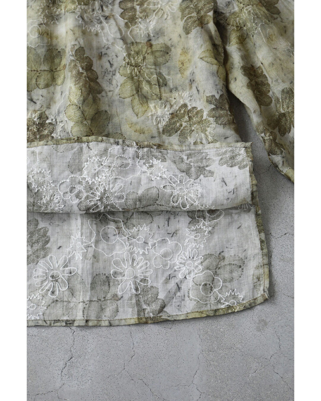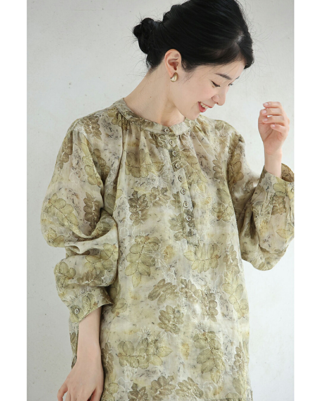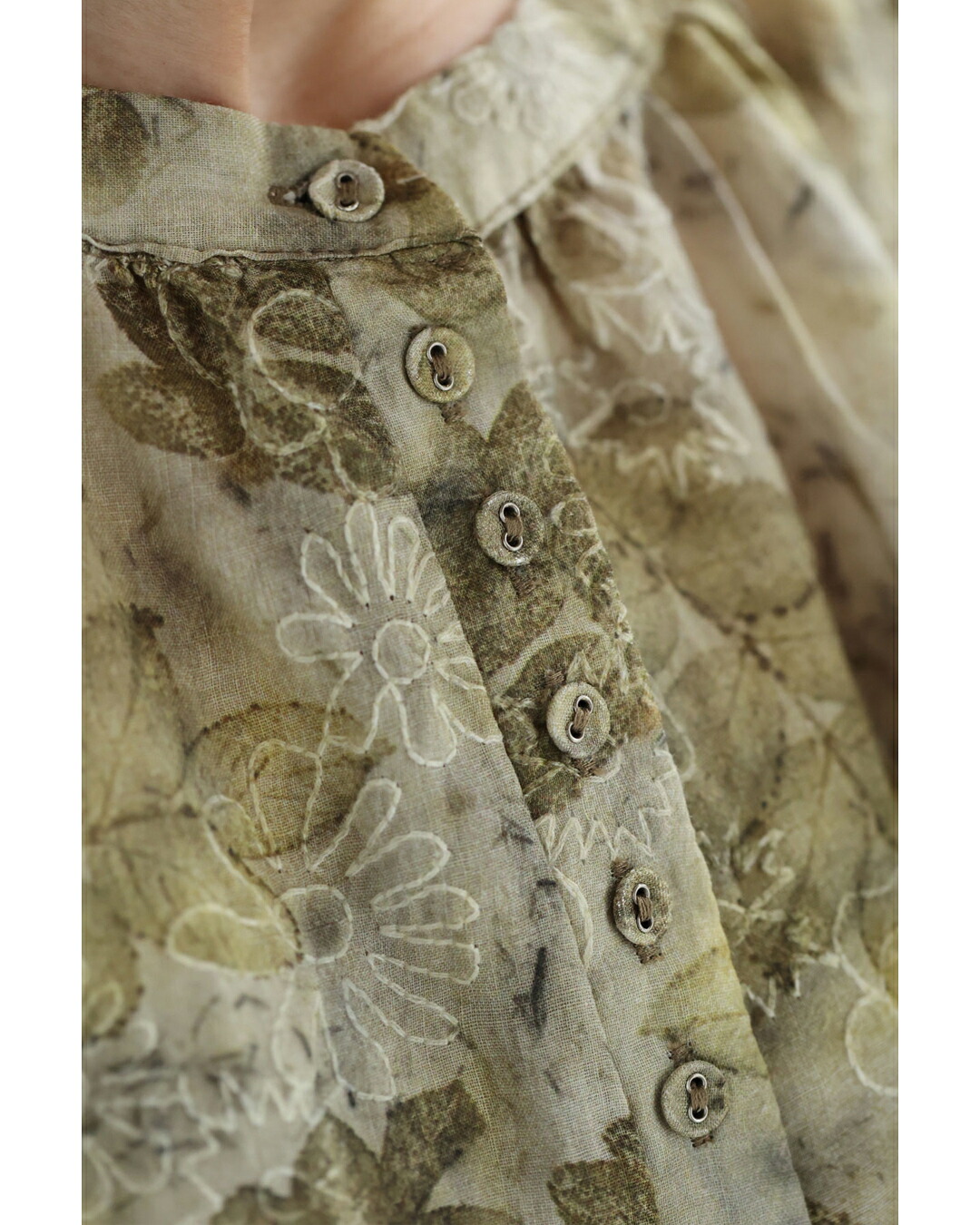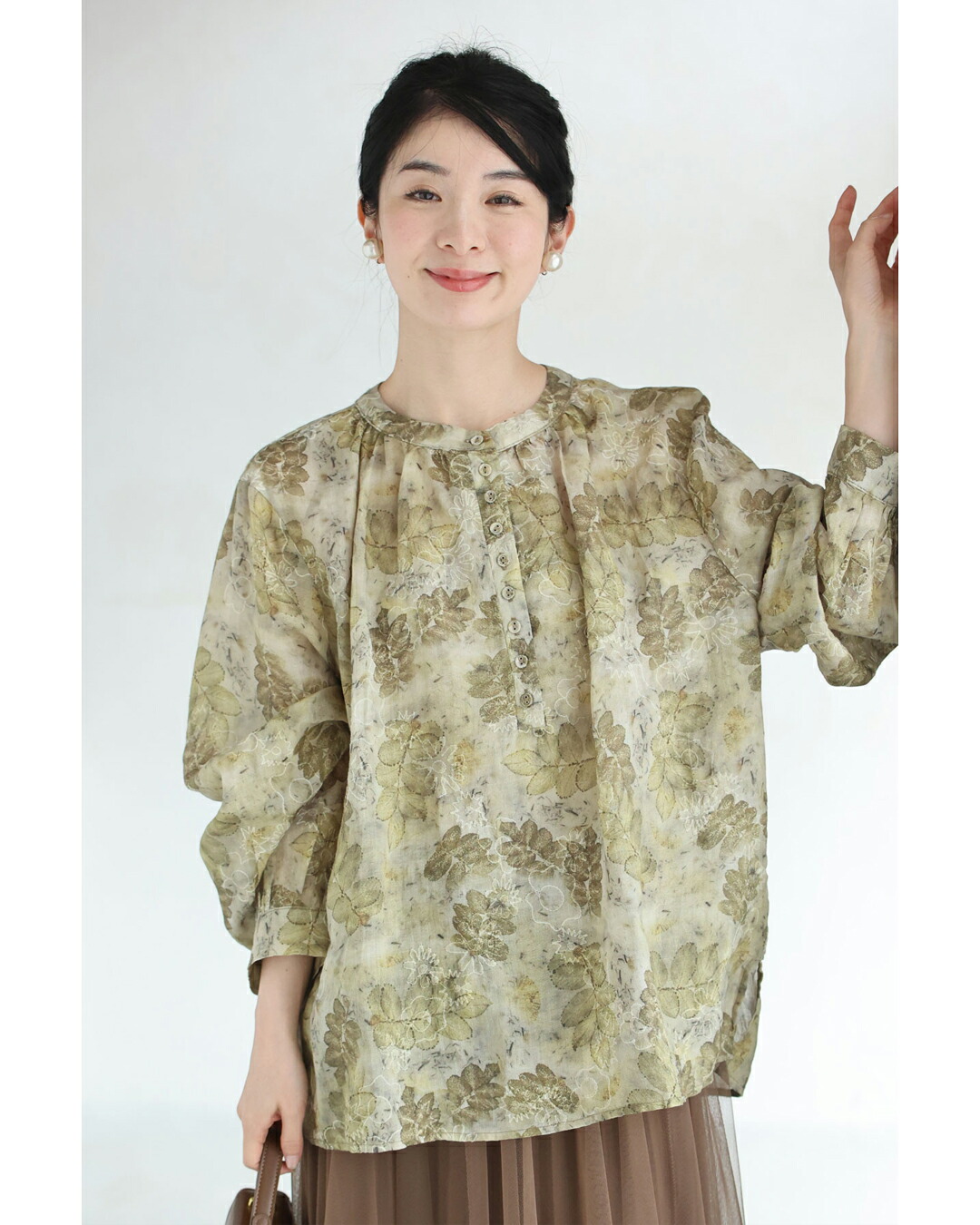 w61103ps 新作 新着 再入荷 CAWAII FRENCHPAVE フレンチパヴェ エレガント ベーシック カジュアル 可愛い かわいい カワイイ おしゃれ オシャレ お洒落 個性 個性的 定番 ベーシック 大人かわいい 大人可愛い 上品 女性らしい デザイン スタンダード ナチュラル きれいめ キレイめ シンプル フェミニン レディース レディースファッション 大人 ママ ミセス 30代 40代 50代 60代 くったり柔らかな 花 刺繍 浮かぶリーフ柄 ブラウス トップス 長袖 長そで ロング袖 S M L 2L 3L フリーサイズ フリー 小さめ 小さいサイズ 低身長 痩せ ほっそり 小柄 細身 標準サイズ 大きめシルエット 大きい 大きめ ビッグシルエット ゆったり F サイズ自由 薄手 涼感性 涼しい ずずしい 春 夏 秋 春服 春物 夏 夏服 夏物 春コーデ 夏コーデ 軽やか 軽量 グリーン 緑 カーキ 柄 総柄 ガーデン 普段着 日常使い おでかけ 旅行 繊細 麻